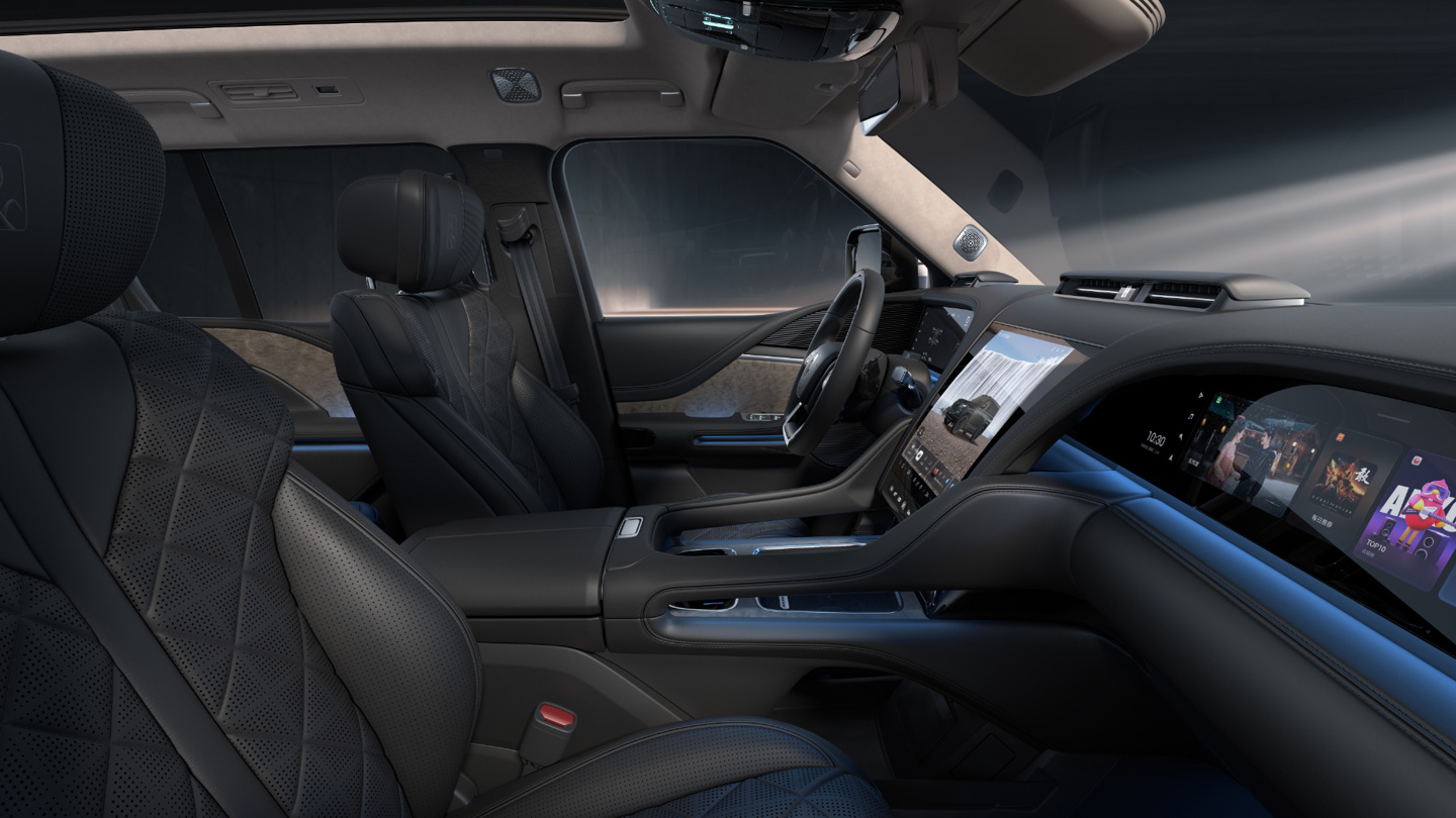 此外,该车还提供 12.8 英寸 OLED 星河曲面中控屏、23.6 英寸仪表屏、23.6 英寸副驾多媒体屏、12.8 英寸后排悬浮式多媒体屏 * 2、7 英寸后排中央扶手液晶屏、流媒体内后视镜、AR-HUD 抬头显示等配置,支持 AI 全场景智能语音、无麦 K 歌、UWB 数字钥匙等功能。