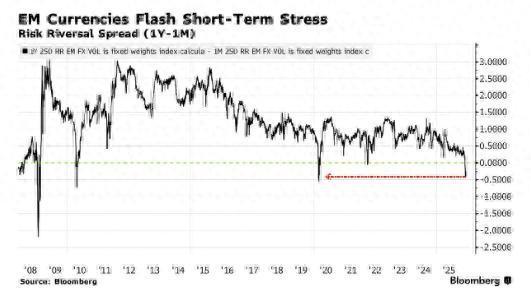 摩根大通追踪的新兴市场货币指数,其1个月期风险逆转指标(用于衡量货币下行保护成本相对上行收益的衍生品)近期大幅攀升。市场愈发担忧冲突长期化将持续推高油价。目前该指标已高于1年期合约,这种短期期权保护成本高于长期的倒挂现象极为罕见。