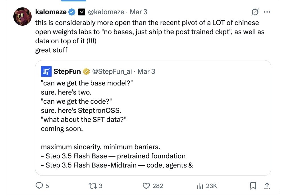 在与阶跃星辰研发团队的沟通中,有开发者希望阶跃星辰可以将基础模型与指令/思考模型一起发布,这样社区就可以对它进行微调了。