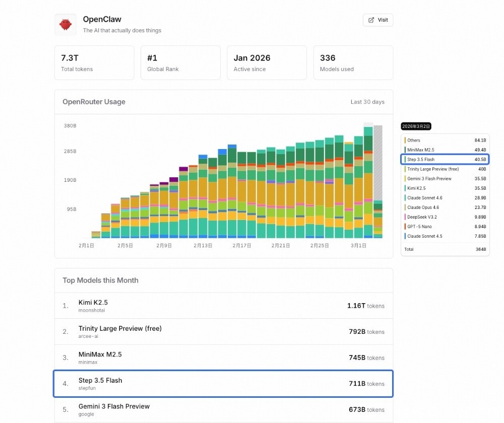 就在3月2日,国内大模型头部创企阶跃星辰在2月新开源的Agent基座模型Step 3.5 Flash单日调用量已超过40B,在OpenClaw的调用量榜中排名第二,超过Kimi K2.5、Gemini 3 Flash Preview、Claude Sonnet 4.5等一众国内外主流模型。