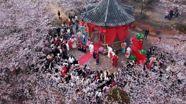 依托河湖生态美景打造的汉服实景演绎等环节,也处处彰显着水韵乡村特色。汉服表演者在河畔樱花树下轻舞,身姿与碧水繁花相映,尽显江南水韵与古风诗意。